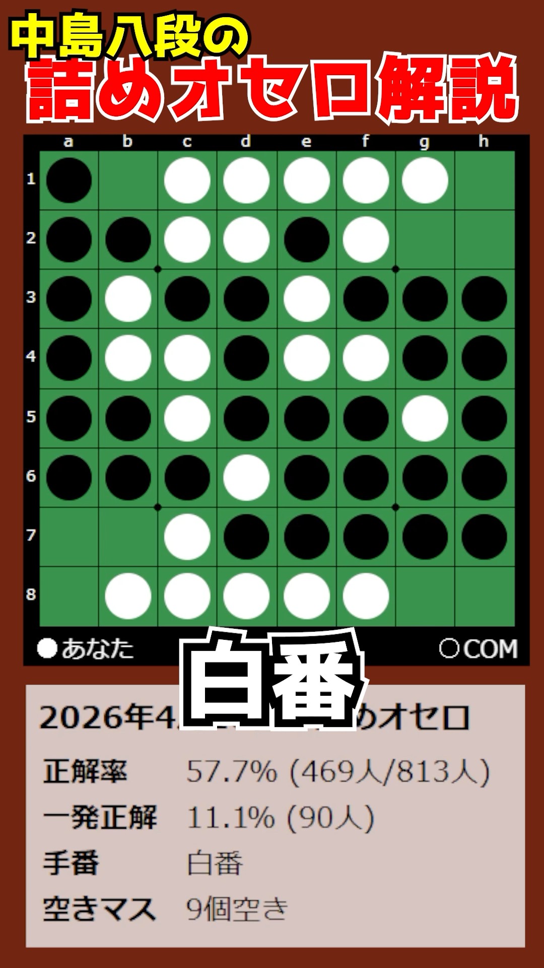 毎日Othello! JAPANで掲載される詰めオセロ問題の解説動画です。※この動画は「YouTubeショート」用に作成したものです#shorts#オセロ#詰めオセロ